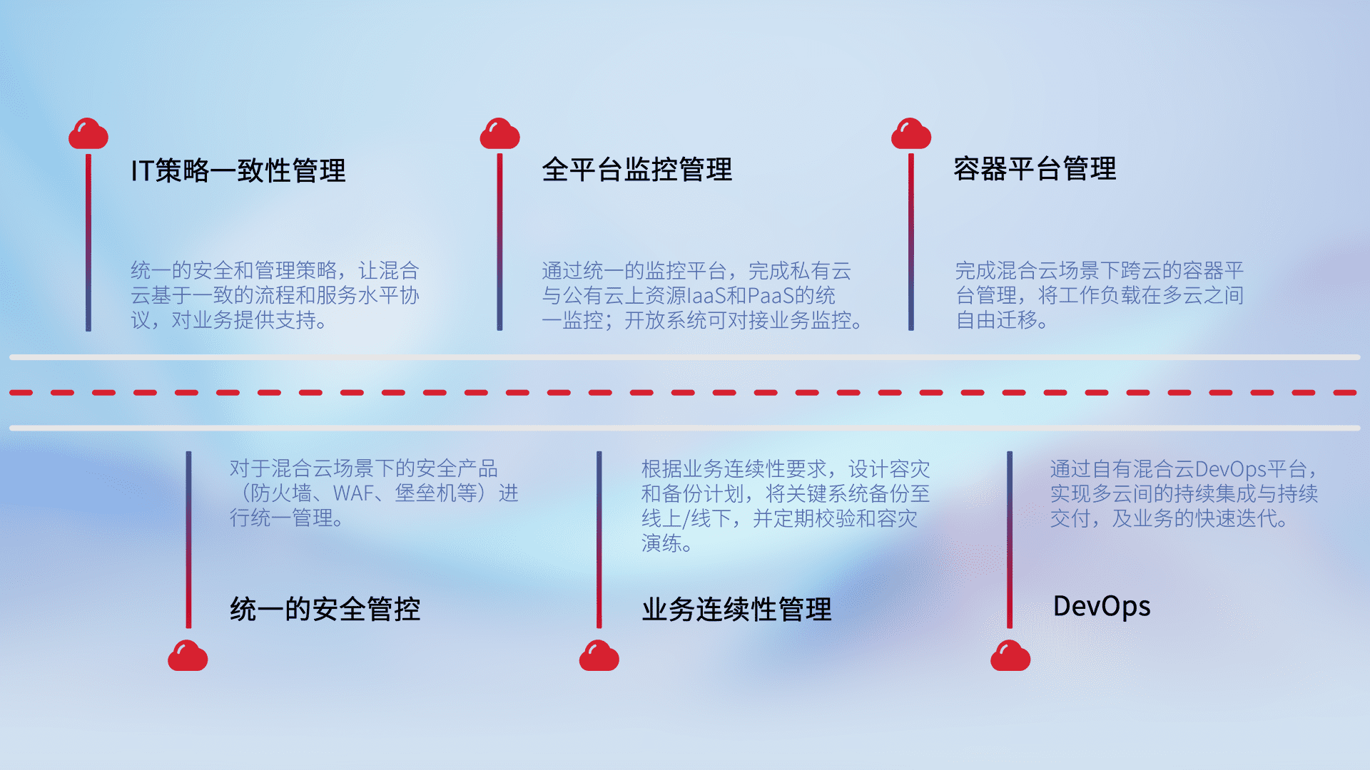 通过多云纳管,,,,以统一的资源数据模型把客户的云资源进行抽象和封装,,,进而实现对多云资源的统一操作,,保障云资源管理的可靠性、、、、稳定性与可用性。。。。量身定制化运维内容,,配置、、、、开发运维、、、、补丁管理、、、备份、、、、监控、、、认证和访问管理、、审计和日常巡检等,,保障在用云过程中的可靠度,,稳定度以及高可用率。。